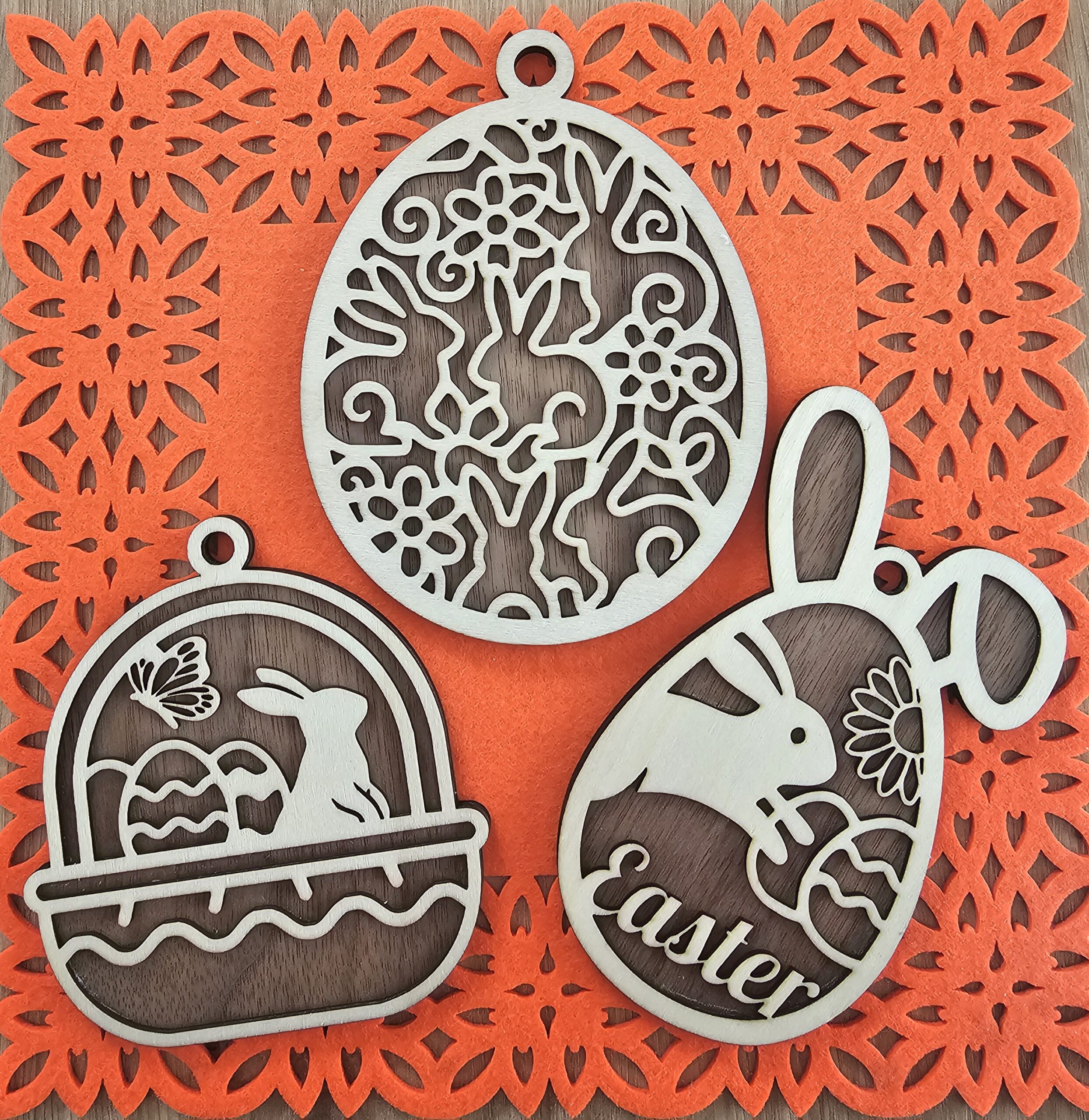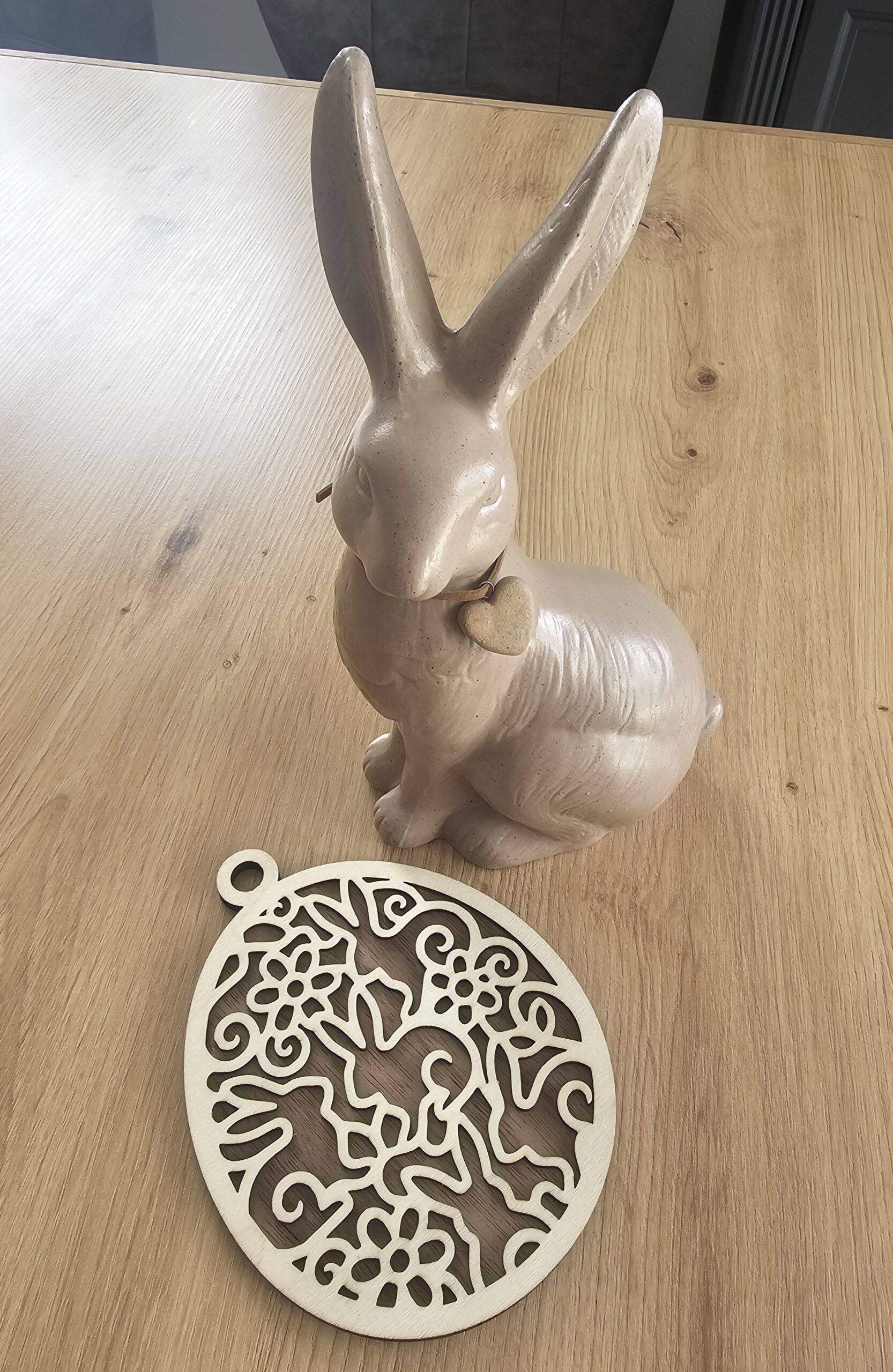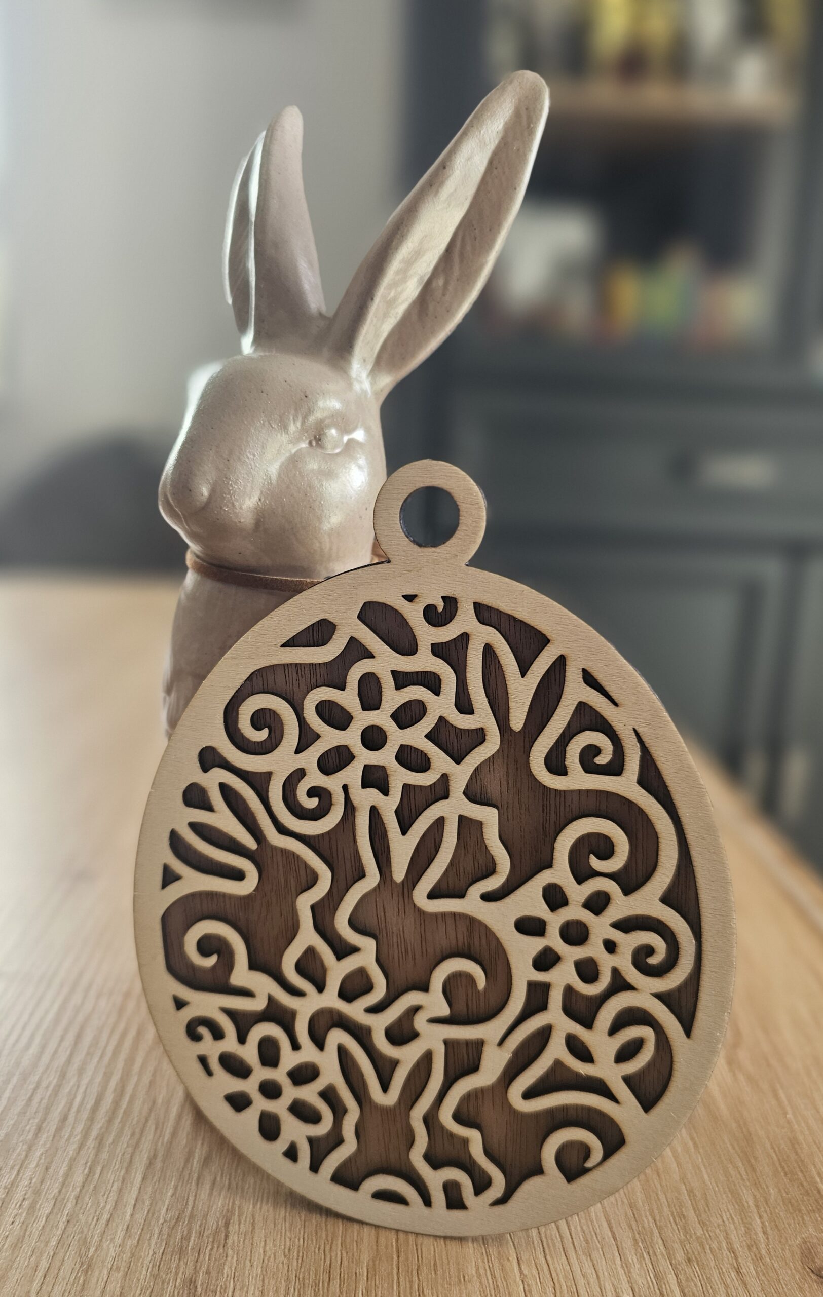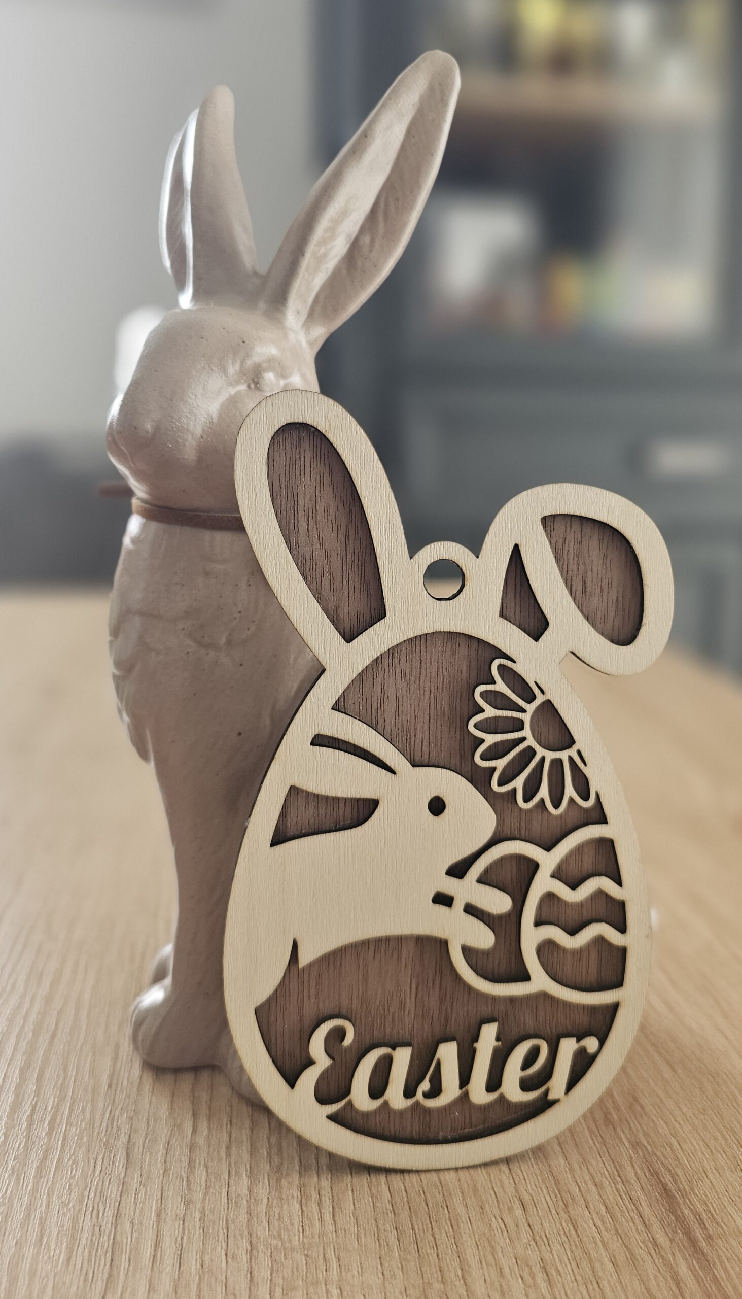 Handgefertigte Oster Anhänger aus Holz im eleganten 3D Look.